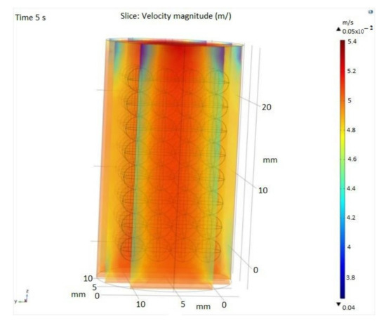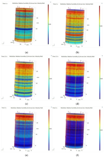 Figure 8 shows the water adsorption process capacity of the SiO2 packed bed at two different flows rates. At a flow rate of 300 sccm, the humidity evolution in time (after 1, 2.5 and 5 s) is presented in Figure 8a–c and at 600 sccm in Figure 8d–f. These numerical simulations aimed to evaluate the adsorption capacity of SiO2 pearls in order to determine the optimal input flow of the gas sample.