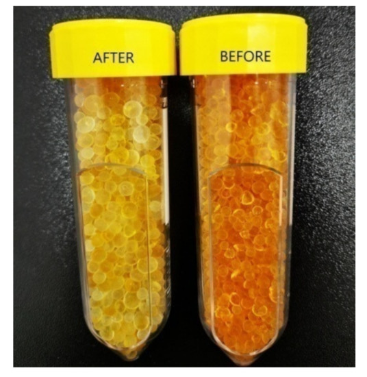 In our experiments, we used SiO2 orange typically Roth pearls of (2–5) mm(Figure 2b), with the following properties: total adsorption capacity similar to blue gel (Silica Gel Blue), large surface (approx. 750 m2/g)which enables high absorption capacity of steam, adsorption capacity: approx. 40 wt% at 80% relative humidity, patented humidity indicator—heavy metal-free, color change from orange to colorless at approx. 6 wt% load, drying pearls orange: boiling point (bp) >999 °C, melting point (mp) >550 °C, regeneration at 130 °C, ≈ 4 h.