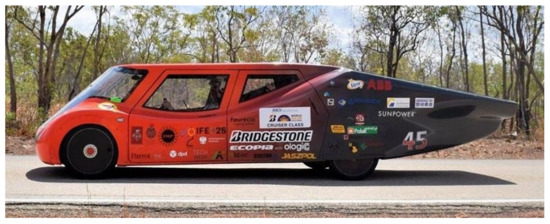 Eagle Two is a 5-passenger vehicle of total weight equal to 600 kg, powered by a 60 kWh lithium-ion battery and driven by 2 brushless direct-current motor (BLDC) electric motors with a total power of 10 kW. The electric energy is supplied to the battery by 5 m2 of photovoltaic panels of 24% efficiency, and the vehicle can also be charged using an electric charger. Eagle Two is characterised by a very low aerodynamic drag coefficient (cx = 0.22), which allows the car to drive up to 1800 km on one battery charge. Figure 1 presents Eagle Two during the Bridgestone World Solar Challenge race in 2017.
