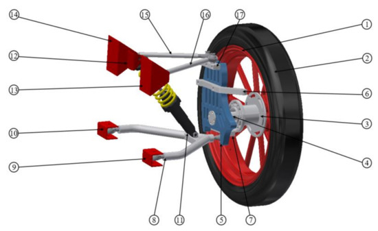 Schema of front suspension system (1—rim, 2—tire, 3—hub, 4—driveshaft, 5—steering knuckle, 6—steering linkage, 7—lower wishbone holder, 8—lower wishbone, 9, 10, 12–14—the connecting elements of suspension to the car chassis, 11—shock absorber with spring, 15,16—upper control arm, and 17—upper rod holder).