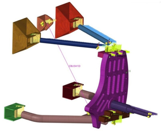The numerical model of the whole front suspension system is presented in Figure 3. The mesh was prepared for wishbones, steering knuckle, driveshaft, spring–shock absorber assembly, connectors, and mountings.
