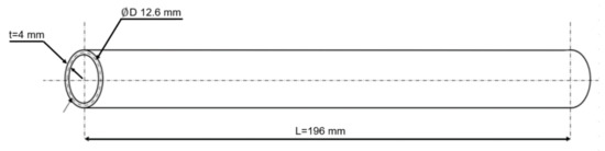 The current construction of the rods is not threatened by the loss of stability due to buckling (in both elastic and non-elastic states) due to very low slenderness—39 for the longer (first) and 36.0 for the shorter (second) rod. Because of the considerable strength margin and based on the initial numerical calculation, it was decided to decrease the width of the rod walls for further research on the effect of laminate characteristics on load-bearing capability. We decided to reduce the external diameter of the rods, while the internal diameter and their lengths remained unchanged. Figure 5 presents the shape and dimension (D = 12.6 mm—mid-thickness dimension, t = 0.6 mm—wall thickness, and length of the rod L = 196 mm and 180 mm for longer and shorter rod) used in numerical models of the composite rods.