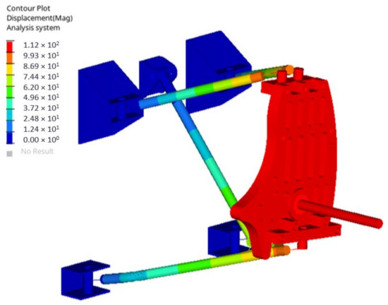 The analysis results showed that the maximum displacement in the suspension system reached 111.7 mm and is related to the spring-damping element, which, under the loading, shortens and allows displacement of other suspension system components (Figure 7).