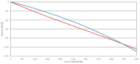 Axial force in rod 1—blue, axial force in rod 2—red.
