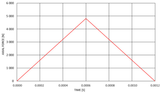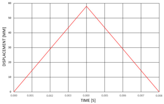 Reaction forces due to static loading are relatively low compared with the material yield strength; however, the suspension system is not only designed to withstand static loads. Its primary function is to carry dynamic loads. Therefore, a non-linear transient dynamic analysis was performed due to passing an exemplary road bump with the height of 58 mm (maximum capability of the vehicle suspension system) with the assumed speed equal to 45 km/h = 12.5 m/s. Hence, the total impulse time was equal to 0.008 s. The loading was applied as a displacement in time on the driveshaft. The dynamic impulse was assumed as a triangular shape with linear increasing and decreasing displacement—presented in Figure 9.