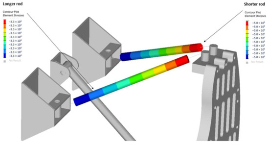 As a result, maximum compressive stress was obtained equal to 33 MPa for the longer rod and 50 MPa for the shorter one (Figure 10).