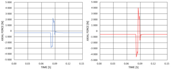 Figure 11 presents the normal reaction forces in both rods as a function of time. This behaviour is related to the oscillations of the system. In case of the longer rod, the maximum normal force is obtained during compression and is equal to 2867 N, whereas, for the shorter rod, the maximum compressive force is equal to 4433 N. The forces with positive values are similar to compressive ones; hence, they were not included in the further work due to the small stress value and the fact that, in the case of tensile, they do not lead to buckling.