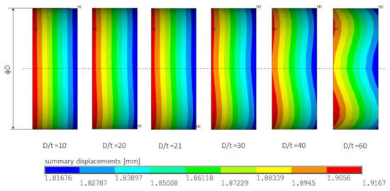 In the beginning, it should be pointed out that, considering the layer arrangement along with the rod thickness, they are not symmetrical and can cause non-obvious behaviour due to non-zero elements of the ABD laminate stiffness matrix responsible for the coupling between loads and deformations. Nevertheless, the considered structure is treated as a rod (not as a thin-walled shell structure), and, according to cross-section axes of symmetry, the layer arrangements are symmetrical. To prove the above, a simple numerical test was performed. Assuming the constant relation of L/D = 15.5 and different D/t = 10, …, 60 ratios (in the considered rod D/t = 21) for the rod with circular cross-section and layer arrangements No. 5 (c.f. Table 3), the compression test was performed, and summary displacements were determined. The results presented in Figure 12 show summary displacement on the side of the rods only in their middle part of length equal to c.a. 0.5 D. Comparing the displacement distribution, it can be easily noticed that, for D/t > 30, the displacement distributions are not constant as in the case of uniform compression—the effects of non-zero elements Bij, D16, and D26 of ABD laminate stiffness matrix.