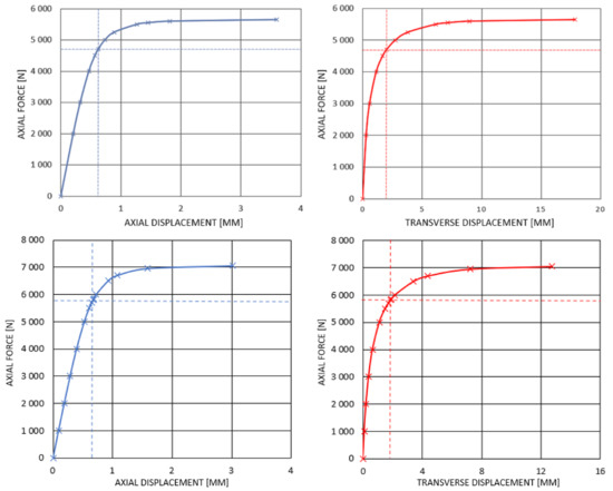 According to the numerical simulations, a loss of stability due to buckling will not occur. Before that, the initiation of the composite failure process will take place (Table 4 and Table 5). The force corresponding to the Tsai–Wu index equal to 1 is lower than the critical static force determined in buckling analyses. Furthermore, it is also lower than force corresponding to buckling of the rod with 5% imperfection (according to the definition, the loss of stability occurs when, for small loading increment, a substantial increment of displacement takes place). Figure 13 presents the axial and transverse displacement plots and compressive force for both considered constructions—stacking sequence 4 (02/45/−45/902) for rod 1 and stacking sequence 7 (90/45/90/−45/02) for rod 2. Dashed lines indicate forces for which failure index reached 1.