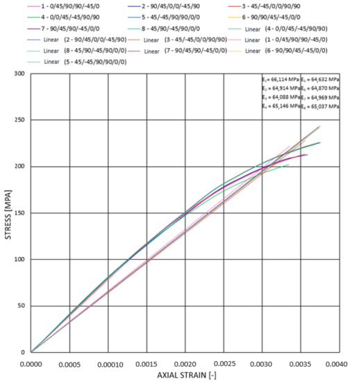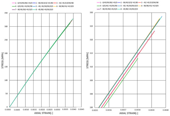 Analogically, we performed analyses for each of the 8 stacking sequences for the longer rod. Figure 14 presents the stress–strain relationship for compression for all considered stacking sequences.