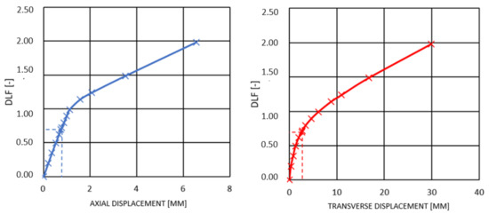 In case of all considered rods and their stacking sequences, it was observed that, as previously, the composite failure process is initiated (Tsai–Wu index reaches 1) before the dynamic buckling phenomena are observed. According to Budiansky–Hutchinson’s criterion [11], a loss of dynamic stability occurs when for a small increment of loading, there takes place a rapid increment of deflection. Figure 17 presents an exemplary DLF (dynamic load factor) plot as a function of displacement in longitudinal and transverse direction for one of the rod 1 stacking sequences. The dashed lines indicate critical DLF corresponding to failure index equal 1 (approximately 0.7).