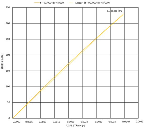 According to the Epoxycarbon UD396MPa characteristics and the results of performed numerical analyses of the rods with stacking sequence (06), (45/–45)3, and (906), the highest Young’s modulus is observed for composite with longitudinal layers. Its stiffness is 10 times higher than the stiffness of those with plies 45°/−45° and more than 20 times higher than that of those with plies 90°. Hence, the highest modulus is obtained for rods with longitudinal (0°) layers from the outside. Due to such significant differences in elasticity modules (of each layer separately), the placement of layers 45°/−45° and 90° does not significantly influence the resultant elasticity modulus.