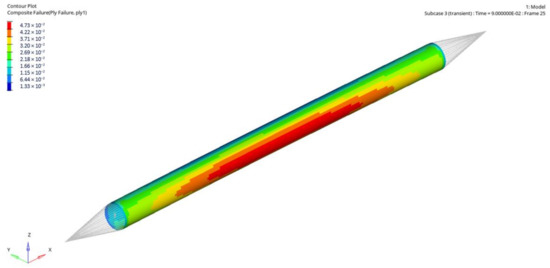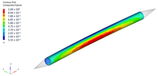 In performed numerical analyses, the resultant forces were obtained corresponding to composite failure (according to Tsai–Wu failure criterion). The FI map for the first stacking sequence (0/45/902/−45/0) for rod 1, corresponding to the failure index equal to 1, is presented below (Figure 15). The distribution of the obtained FI values is very similar for all considered stacking sequences. The most significant change is the number of plies in which the failure occurs; however, it is always a ply with axial fibre orientation because it carries the highest load.
