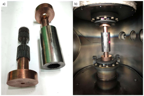 The inner surfaces were coated with oil-free graphite spray. The difference between thermal and electrical conductivities was designed to heat the die instead of the punches and provide high cooling rates. An exploded view of the die assembly is shown in Figure 2a, while the assembly in U-FAST is shown in Figure 2b.