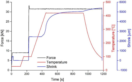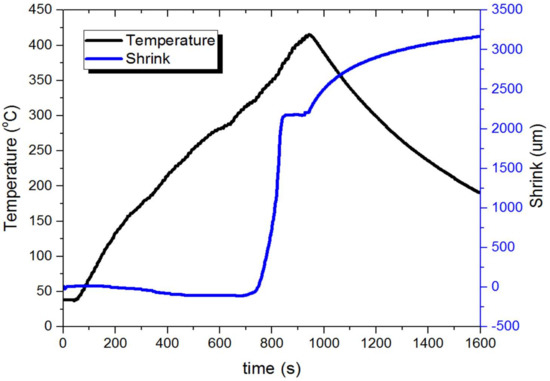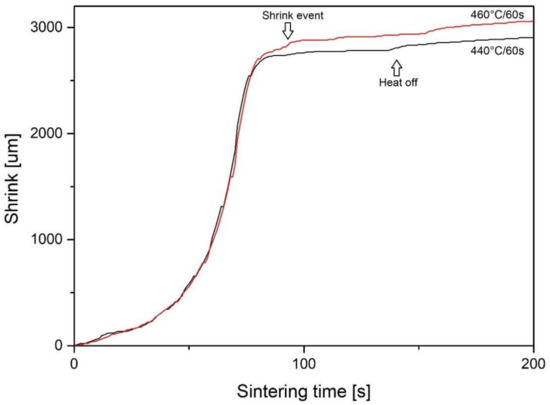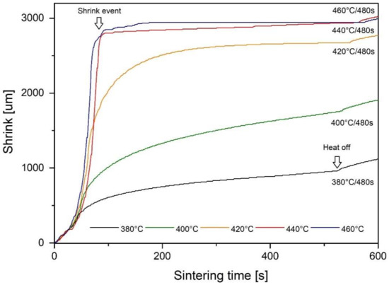 Since a shorter sintering time is desired in commercial applications, samples with a sintering temperature of 440 °C (713 K) and 460 °C (733 K) were processed again with a shorter time of 60 s. A shrink event is still observed at 460 °C (733 K) after 80 s (Figure 5).