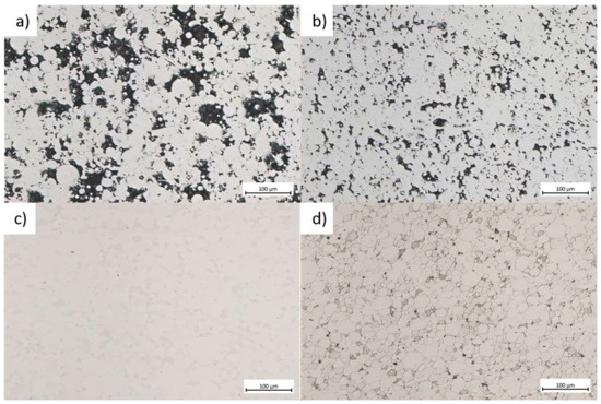 Typical microstructures of sintered materials (a) 380 °C/480 s (b) 400 °C/480 s (c) 420 °C/480 s (d) 440 °C/480 s.