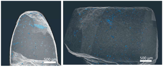 The computer tomography of the gear wheel tooth is shown in Figure 10. Most of the pores are located at the edge of the sintered sample. The total porosity of the sample was estimated with CT software at 0.037% with a pore size distribution of 12–50 µm and a mean size of 17 µm. This may be ascribed to cold sintering at 420 °C (693 K), pressure loss due to friction of the powder particles on the surfaces of the preshaped dies or incomplete filling of the small features with relatively coarse particle size powder. It should also be taken into consideration that the purchased powder contained gas inclusions from atomization process, which are not completely reduced in the sintering process at a given temperature.