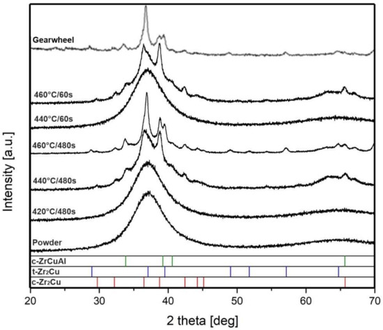 The XRD diffractograms in Figure 11 infer that the material compacted at 420 °C/480 s (693 K/480 s) and at 440 °C/60 s (713 K/60 s) remained amorphous. Increasing the temperature or the time beyond those conditions led to the formation of cubic phase Zr2Cu PDF [01-074-7476] and three-component cubic phase ZrCuAl [04-018-3885] or [04-020-8421]. The diffraction peaks of tetragonal phase Zr2Cu [04-015-7358] are detected in materials treated at 460 °C (733 K). As shown by Hao et al. [25] electric pulses can induce non-equilibrium phases, other peak values are assigned to such phases which could not be clearly identified. As can be seen in the XRD diagram, the sample in the form of gear was crystalline. It was apparently caused by exceeding the crystallization temperature in the sample, which was overstepped due to the thermal inertia of such a large sintering system. The XRD patterns for the samples sintered at 380 and 400 °C (653 and 673 K) were fully amorphous and very similar to the samples sintered at 420 °C (693 K) and are therefore not shown in the diagram.