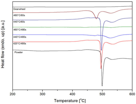 Differential scanning calorimetry results are shown in Figure 12. Initially, DSC curves of 420 °C (693 K) sample and raw powder do not show any clear difference. In both cases, the calculated enthalpy of crystallization was 57 ± 2 J/g (Table 1) at a crystallization temperature of 496 °C to 500 °C (769 to 773 K). Minor difference in the shape of the peaks was attributed to the different thermal conductivity of the sample (bulk and particulate body). Significant differences can be observed at temperatures above the glass transition point −400 °C (673 K). The bulk sample showed no significant effects, while the raw powder showed a visible relaxation effect, followed by a small endothermic event. The point of inflection (Tc) was calculated at 309 °C (582 K) which is the same temperature as the offset in the shrink curve (Figure 4).