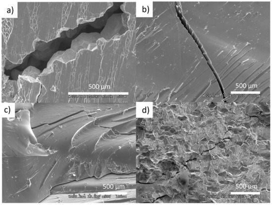 Fracture surfaces of all sintered materials are shown in (Figure 13a–d). The materials with 100% amorphous content showed a typical vein pattern on the main fracture surface with zig-zag cracks perpendicular to the main fracture plane. The 420 and 440 °C/480 s, as well as 440 and 460 °C/60 s (733 K/60 s) samples, showed both “intergranular” cracks (Figure 13a) and vein pattern (Figure 13a,c,d). As shown by Nowak et al. [24] the “intergranular” interface can be weakened by oxides present on the initial powder particles’ surface. For the samples sintered at 380 and 400 °C (653 and 673 K), neither the hardness nor the compressive strength could be accurately measured. Due to the porosity of the samples, handling of the sample led to cracking and disintegration, hence further tests were not possible. The higher hardness results (Table 2) of the samples compared to the manufacturer’s cast sample result from the structure of the material. Metallic glasses have an amorphous structure, which is characterized by a denser packing of atoms and the lack of translational symmetry in atomic structures, which results in the absence of expanded defects occurring in crystalline metals. The actual defects in the BMG are much smaller and only become active when greater stress is applied.
