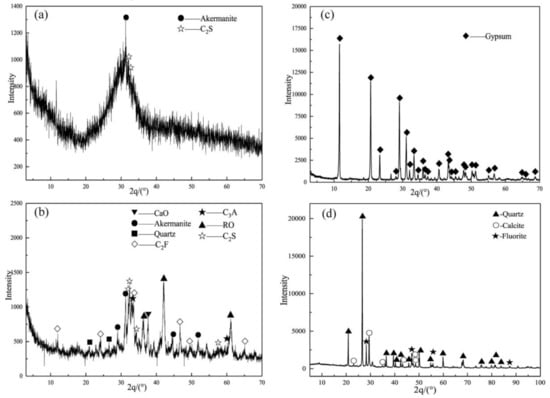 XRD patterns of the raw materials: (a) GGBFS; (b) SSP; (c) FGDG; (d) AT.