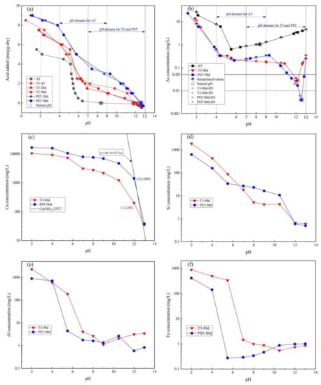 Figure 3c–f present the equilibrium concentrations of the main elements of T3-90d and PST-90d as a function of leachate pH by interpolation to the target pH for clarity (Equation (4)), which were closely related to the release of As. The Ca concentrations of natural T3-90d and PST-90d were 199 and 803 mg/L, respectively, which increased with decreasing pH and decreased when base was added. The line in Figure 3c represents the solubility equilibrium curve of Ca(OH)2 at 25 °C (Equation (9)), indicating that the solubility of Ca(OH)2 controlled the Ca release over pH 12–13 for PST-90d and at pH 13 for T3-90d, leading to the decline in Ca concentration to 38 mg/L and 35 mg/L, respectively, at pH 13. The natural pH for PST-90d was close to the pH of 12.60 for saturated Ca(OH)2 solution at 25 °C because the hydration products of OPC contain Ca(OH)2 (~25 wt.% [37]); since the hydration reaction of SSB only contributes to a very small amount of Ca(OH)2 [11], the leachate was unsaturated in Ca for T3-90d with added KOH over the pH range of 12–13. Figure 3d shows that the Si concentration increased with the addition of acid, except for the observed plateaus for T-3-90d and PST-90d over the pH ranges of 5.5–11 and 8–11, respectively.