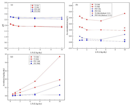 Figure 4 presents the As LSP behavior as a function of L/S, where the leachate pH of T-3 and PST remained at ~12 and ~12.6 respectively, over the L/S range of 0.5–10. The As concentration of T3-90d and PST-90d decreased and then remained unchanged at L/S ≥ 2 as the L/S increased. The As concentration of T3-28d and PST-28d first decreased in a similar way compared to the samples cured for 90 d but exhibited an upward trend at L/S ≥ 5 with significantly higher values at an L/S of 10, which is consistent with the characteristic As leaching behavior in the pH range of 12–13 (Figure 3b).