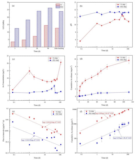 Method 1315 results: (a) comparison of UCS values of samples with different curing times to the results after 112 d of semi-dynamic leaching; (b) pH; (c) As concentration; (d) cumulative As release; (e) flux in the different intervals; (f) log-log plot of cumulative As release over time for T3-90d and PST-90d.