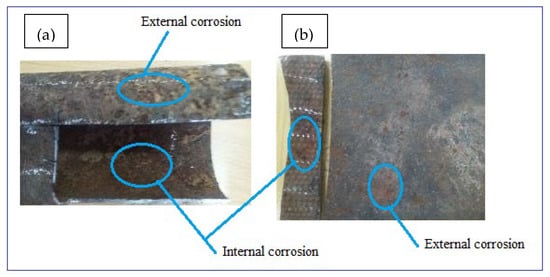 SEM image of corrosion damaged GS pipe: (a) external corrosion and (b) internal corrosion.