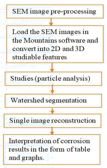 Using Mountains 8.2 digital image surface processing software; the SEM images were analyzed following the procedures as shown in Figure 3. The method is effective to analyze from minimum or threshold level to the maximum values of pit depth, area, diameter, and volume per particle of the selected image sample.