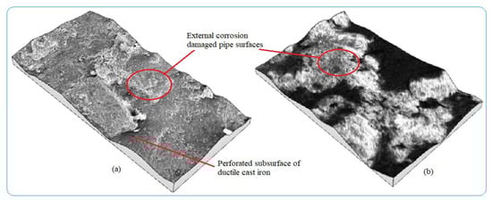 3D images of external corrosion damaged pipe surface: (a) Ductile iron pipe and (b) Galvanized steel.