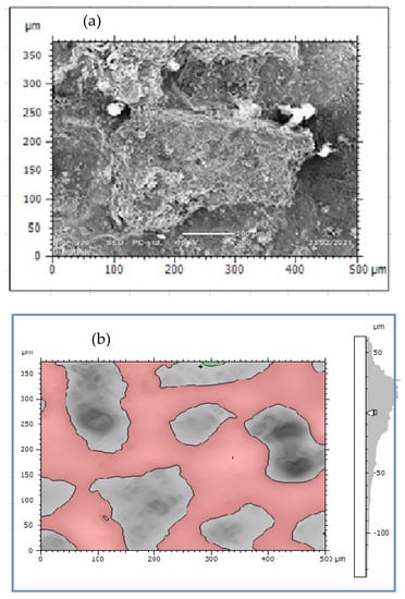 The rate of pipe surface deterioration accelerates with the presence of chlorine ion which dissolves iron particles at the anodic site. Others such as galvanic, uniform, and pitting corrosions are the failure mechanisms of water pipes. The formation pitting passes three stages; namely, pitting initiation, pitting growth, and pitting termination or leakage. At the initiation phase, the external surface including coating has direct contact with moisture and oxygen which can form films. The films then easily break due to electrochemical reaction and create initial pitting which damages the coating and then the external surface. The pits growth occurs at the second stage and damages the external pipe surface then it proceeds to the subsurface of the pipes due to the formation of depth. At this stage, stress corrosion cracking contributes the rate of pit corrosion to be faster and the size of pits grows easily. Depending on the variations in pit depth and width, a local colony of pits meets each other and the surface of the pipes deteriorates layer-by-layer as shown in Figure 5a. Further dissolution occurred at the anodic site and consequently, the growth of pits form pipe breakage and leakage. The cycle continued to damage the external and subsurface are easily attacked by electrochemical reactions. When the pit depth increased, it can hold more amount of moisture and oxygen which accelerated the rate of corrosion till leakage formation. This indicates the combined effect of pitting and uniform corrosions lead to surface deterioration with time function. Figure 5b presents the result of topography features of image processing obtained from corrosion morphology of DIP deteriorated surface which identified peaks and dale of the surface textures. The topography of the damaged surface was filled with watershed detection to process it for further analysis at particle level categorizing by grain boundaries. From the image analysis, it is concluded that the Mountains 8.2 surface analysis software identified the topography of corrosion failed pipe surface that the structure is deteriorated layer-by-layer creating the peaks and dale of corrosion damaged surface which indicates the process of corrosion rates.