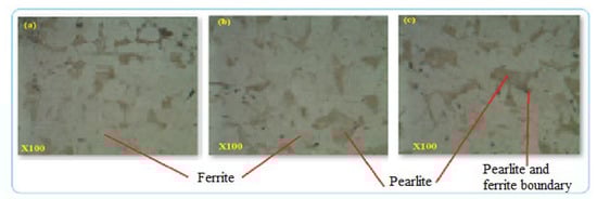The composition of alloying elements and manufacturing process were able to create defects that contribute to corrosion formation especially when there are voids and micropores in the structure. Cross-sections of metallographic structures of 4” galvanized steel water pipe were shown in Figure 6. The samples give full structural information of grain size and boundaries that were observed as uniform distribution of alloying elements. The microstructures were analyzed at a magnification of 100× under optical metallurgical microscopy and the structures were observed as pearlite with dark color and ferrite marked by white color Figure 6. The cross-sectional surface micromorphology shows that the possibility of particle deterioration formed on the surface where at the interface between ferrite and pearlite due to the two dissimilar structures acting as galvanic corrosion. The uneven distributions of alloying elements lead to microcracks at the boundaries and develop low corrosion resistance to the products which forms intergranular corrosion along the contact lines. Directional grains can create intergranular corrosion that causes the formation of microcracks in the structure. Non-uniform alloying elements and grain structures developed uneven morphologies in the internal microstructures which were formed as intergranular corrosion. The microstructure analysis was conducted from the sample of the new galvanized steel pipe cross-section, not from the top or bottom surface. The reason was to evaluate the internal details easily from the cross-sectioned part and to control the effect of zinc coating on the micrographs. Figure 7a–c are the images of optical microscope from the sections of three GS pipe samples. The images have similar internal microstructures consisting of ferrite and pearlite structures which are separated by the grain boundaries.