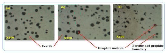 The typical ductile iron pipe was used for the characterization and is shown in Figure 7. The distribution and amount of alloying elements have their effect on the microstructures and defect formation. The microstructures indicated spheroidal graphite shape distributed in the DIP structure and surrounded by -ferrite. Graphite makes the pipe have better tensile properties than other types of cast-iron pipes. The size and shape of graphite depend on the manufacturing process of the pipe. At the boundaries of graphite and pearlite or ferrite, corrosion initiation can be developed due to dissimilar structures. After 40 years, DIP pipe was deteriorating relatively at a faster rate and its safe service condition was 50% pipe thickness loss. Beyond this thickness, the rate of corrosion was faster which caused water quality reduction and consequences to pipe leakage and breakage. Figure 7a–c are the optical microscope images of the three DIP samples which were cut from the same pipe. The images comprises ferrite and graphite nodules in the microstructures of the samples. All the specimens have similar metallurgical structures and have corrosion tendency between the contacts of unlike microstructures.