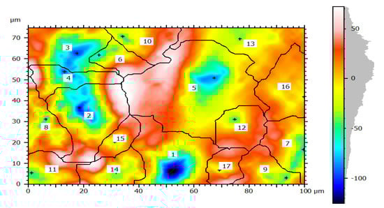 In this study, the external pipe corrosion was evaluated and which was affected by the soil environmental parameters including pH, resistivity, total nitrogen, moisture, loam soil type, and bulk density whereas the internal pipe corrosion mechanisms were the low level of dissolved oxygen (80–81 ppb), conductivity (171.4–493.4 µS/cm), CaCO3 (77–215 ppm), total dissolved solids (TDS) (84.10–262.8 ppm), flow rate (1.5–2.5 m/s, internal pressure is 350 KPa, service load, and ClO2, (0–0.5 ppm). The topography of corroded surface filled with watershed segmentation which was generated from the SEM image as shown in Figure 9. It displays that the image was divided automatically by the software into several particles and labeled by the numbers with grain boundaries. This was important to characterize corrosion features as per particle level. After characterization of each particle, the results were summarized by the software itself in the form of a table and graphs as is depicted in Figure 10.