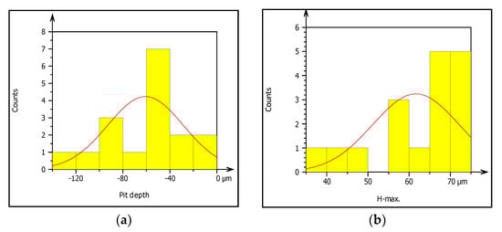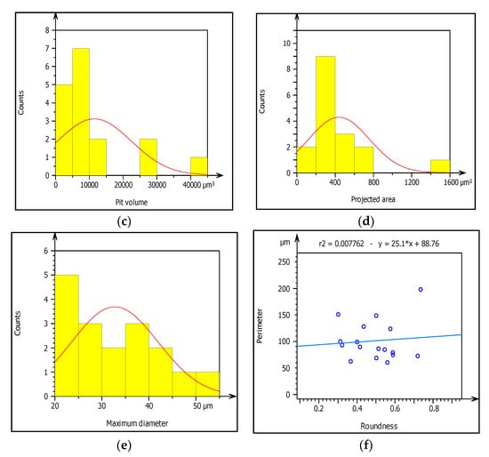 Figure 10a–f presents summary result of corrosion characterization of image processing analysis including pit depth, maximum height from the neutral line, pit volume, pit area, maximum pit diameter and pit shape. The figures show the outputs of watershed segmentation of the entire SEM image to analyze particles, grain boundaries, and other features including pit area, depth, shape, cavity, and diameters from the 2D image. The results of image processing are represented graphically in Figure 10a–f. Figure 10a shows the threshold values of pit depth which are ranged from (40–120) µm even though both values are very small which can be considered as uniform corrosion. Figure 10b presents the result of maximum height (Z-max) which is above the mean line of surface features.