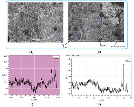 Figure 11c presents the cross-sectional details of the corrosion-damaged pipe surface. Maximum pit depth was found at the center of the surface; similarly, a more damaged surface with pit and crack was found at the left age of the sample (Figure 11d). As compared to the two figures of cross-sections, Figure 11d has more pit depth and crack propagates than Figure 11c.