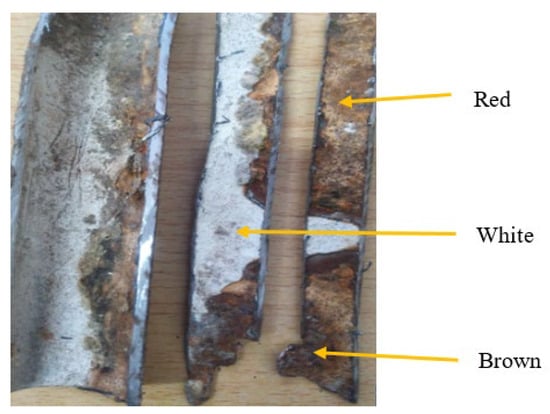 During service time, the internal pipe surface wall gets rough, and turbulent and laminar flows develop into the bubbling of the water which indicates oxygen entrapment in the water forming erosion–corrosion that affects the corrosion of the pipe, severely reacting with water to form hydroxide and ferrous ions as shown in Equations (1) and (2).