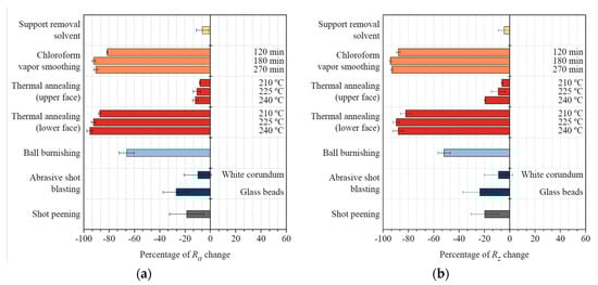 The mass and dimensional changes of all specimens subjected to the different post-processing techniques are summarized in Table 2. Differences in mass, height, width, and length are given as absolute values.