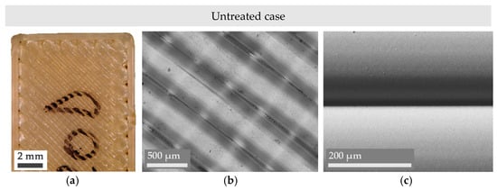 Figure 3a reveals that, compared to the pristine case, Ultem has lost some of its characteristic shine after being submerged in a mixture of 1,4-dioxane and toluene for 4 h. This tonality change could be explained by the presence of an Ultem residue that has been partially dissolved and non-uniformly redeposited along the interfilament space (some zones are more coalesced, but some are not), as the more magnified central and right images (Figure 3b,c) show.