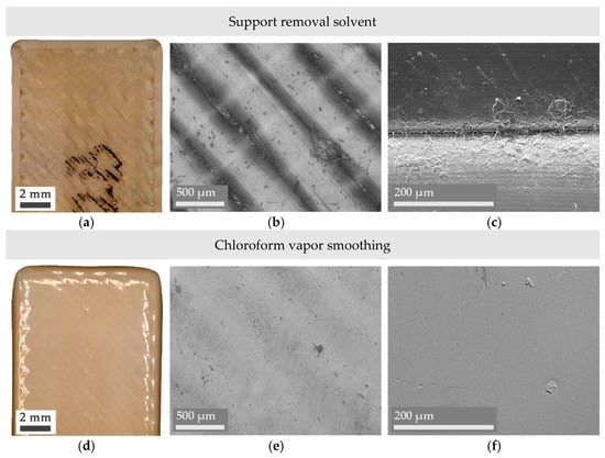 As the roughness analysis has revealed, a drastically different surface is obtained when Ultem is vapor-smoothed in the presence of chloroform (Figure 3d–f). Microscopy results display a smooth surface where the additively manufactured nature of the part is almost inappreciable as Ultem filaments from the outer surface have completely melted and resolidified, forming a uniform layer. This result confers perspective and validates the effectiveness of the other analyzed chemical treatment: In comparison with vapor smoothing, Ultem’s surface is much less affected despite being in direct contact with a chemical mixture capable of dissolving a support material with a similar chemical structure to Ultem’s.