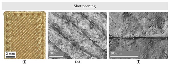 Finally, microscopy images from the shot peened samples (Figure 5j–l) show a shinier surface due to the presence of metallic residue from the stainless-steel beads. Interestingly, despite the longer duration of this treatment (10 min versus 10 to 20 s in the case of abrasive shot blasting), it has resulted in a more uniform surface due to its more controlled nature (shot peening was performed in an automated chamber and with a higher distance between the gun and the samples). In addition, the impact of spherical metallic beads has induced pressing of the part’s external filaments, which denotes the application of compressive stresses that could be beneficial for the fatigue life of the parts. Considering the simplicity of this process and the insignificant affectation of the parts’ dimensions, shot peening’s effect on the mechanical properties of FFF Ultem parts is a key point that should be addressed in future works.