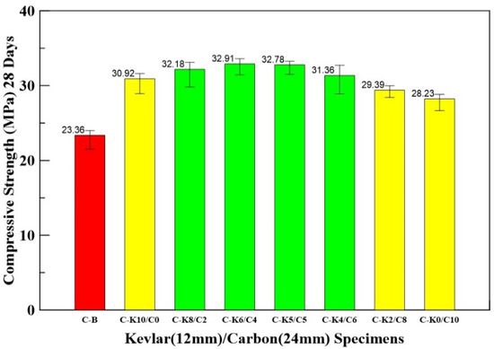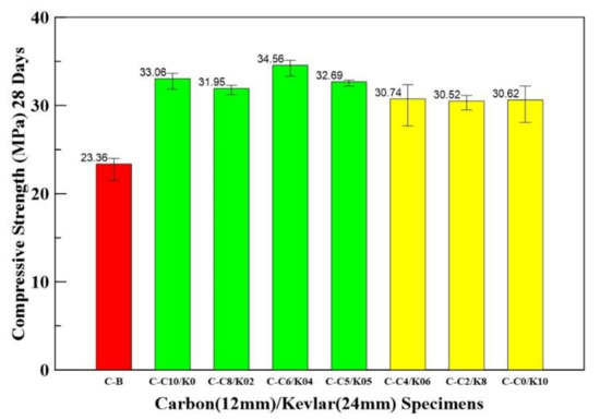 - The compressive test results show that the HFRC specimens attained higher compressive strength in C-C6/K4 (60–40%) and C-C5/K5 (50–50%) mix proportions. Compared with the benchmark specimen, the compressive strengths of the C-C6/K4 and C-C5/K5 specimens increased by 48 and 40%, respectively.