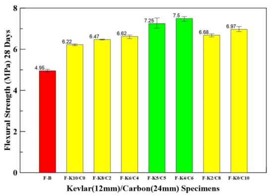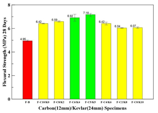 - The F-K5/C5 and F-K4/C6 specimens have better flexural strength than the benchmark specimens, increasing by 46 and 51%, respectively.