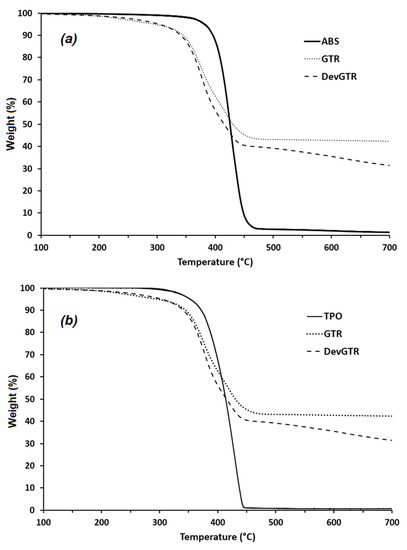 ABS-recycled tire composites were prepared in a Brabender internal mixer at 240 °C (3 min mixing at 30 rpm followed by 7 min at 100 rpm), while TPO-recycled tire composites were prepared at 210 °C, following the same working procedure. The melt processing temperatures were selected to ensure that the polymers could melt during the mixing processing, while limiting the thermal degradation of the rubber phase. In fact, the TGA thermograms of the GTR and the DevGTR particles revealed that they present lower thermal stability than both ABS and TPO matrices (Figure 2), but their weight losses, recorded at the melt processing temperatures of ABS and TPO (240 and 210 °C), remained relatively low. In fact, the weight loss of GTR and DevGTR was, respectively, around 2.7% and 3% at 240 °C and 1.6% and 1.4% at 210 °C. In addition, a residue was obtained at the end of the thermal decomposition (from 30 to 40 wt.%) for all the recycled tire rubbers and corresponded to the amount of the mineral fillers that they contained.