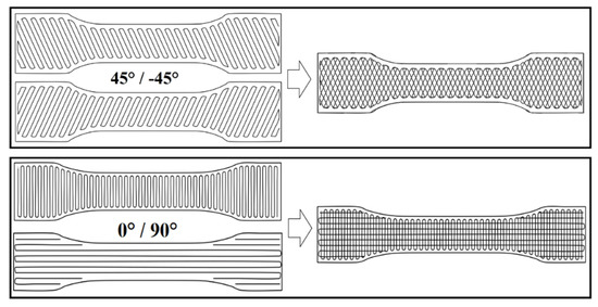 Schematic presentation of the raster angle 45°/−45° and 0°/90°used for the ABS-based samples 3D printing.