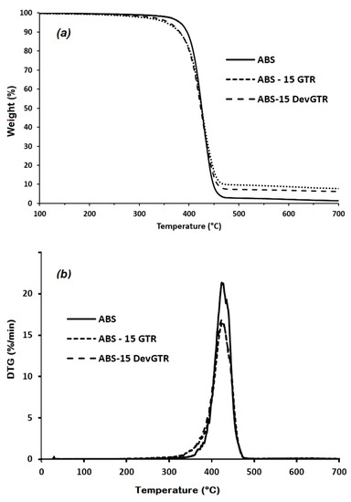The thermal stability of GTR- and DevGTR-loaded ABS composites were evaluated by TGA analysis. Based on the presented TGA and DTG thermograms (Figure 4), it was found that the tire microparticles, independently of their nature, induced a slight premature thermal degradation of the polymer composites (−4%) in comparison to the pristine ABS (−2%) at 350 °C. Since this mass loss is very limited, we assume that the weight loss obtained for the composite is the addition of the decomposition of both phases separately. No further decomposition induced by one phase on the other occurs. The main thermal decomposition step of the composites remains similar to that of pristine ABS, and takes place at 422 °C, as can be clearly evidenced by DTG thermograms. It was also noticed that the residue obtained at the end of the thermal decomposition of the ABS-based composites corresponded to the mineral fraction presented in the tire rubber fraction.