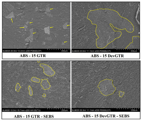 First, and in the absence of SEBS, replacement of GTR by DevGTR allows us to enable some enhancement of the composite mechanical properties in comparison with the ABS-GTR composites. The impact resistance increased from 3.4 kJ/m2 for ABS-15 GTR to 4.4 kJ/m2 for ABS-15 DevGTR. However, this value still remained relatively low, the specimens breaking down completely during the impact tests. This slight improvement of the impact resistance was obtained despite the presence of dispersed rubber domains presenting larger average size compared to the initial DevGTR particles (Figure 5, ABS-15 DevGTR). The formation of such large rubber domains results from the coalescence of the devulcanized rubber particles during melt processing, which allows the blend to reduce its total free energy through phase separation as it is commonly observed in the case of immiscible polymer blends [19,20].
