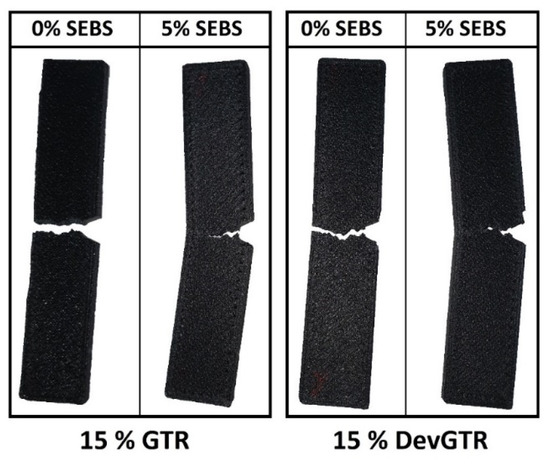 Images of ABS impact specimens (after test), containing 15 wt.% GTR or DevGTR, with and without the incorporation of SEBS (5 wt.%).