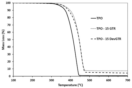 The impact of the incorporated recycled tire microparticles onto the TPO-based composites’ thermal degradation was evaluated by TGA analysis. The TGA thermograms of the pristine TPO and related composites containing 15 wt.% GTR and DevGTR are presented in Figure 7. It was evidenced that the thermal stability of the composites became higher than the pristine TPO, even if both recycled tire powders presented lower thermal stability than the pristine TPO. In fact, the temperature at a weight loss of 5% (T-5%, Figure 7), for both GTR and DevGTR powders, was 230 °C. In contrast, the TPO one was 353 °C and increased up to 370 °C when 15 wt.% of GTR and DevGTR were loaded. This result is of particular interest and revealed that the incorporation of recycled tire powder (GTR or DevGTR) did not lead to any premature TPO thermal degradation and in contrast allowed the production of thermally stable TPO-tire loaded composites.